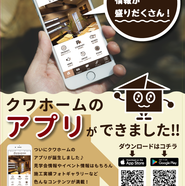 3年ほど提供してきましたクワホーム専用アプリの取り扱いを契約上の理由により終了いたしました。 主にイベントの告知やスタンプラリーでガジュマルがもらえるなどのサービスで楽しんでいただいていたのですが申し訳ございません。 只今、別のアプリで家づくりをされるお客様のサポートをして行ければと準備中でもあります。新たなアプリの情報が届くまでお待ちください。
