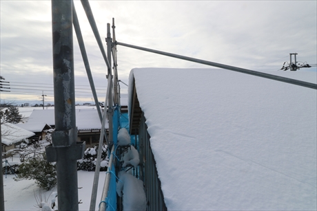この屋根材は雪を落とさないと言われていて雪止めは付いていません。メーカーサイドにも準備が無いんです。