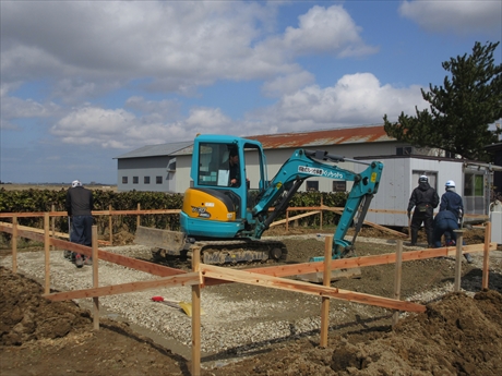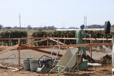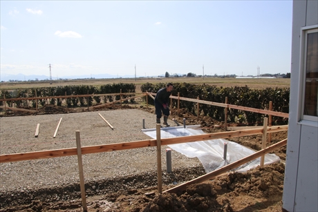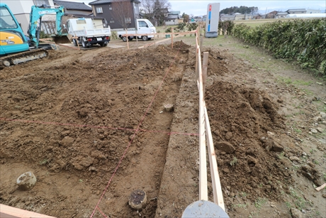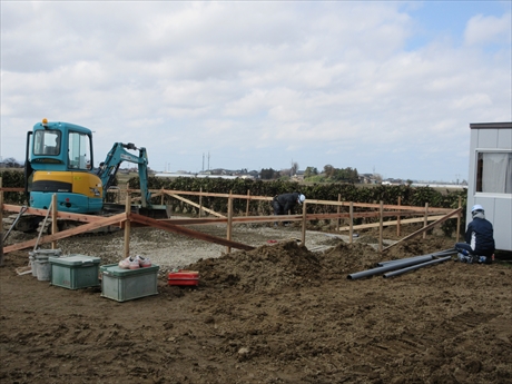 3/13(土)に地鎮祭を行いまして、3/16(火)地盤補強工事をして翌日に遣り方出し。そして3/18(木)から床堀開始です。