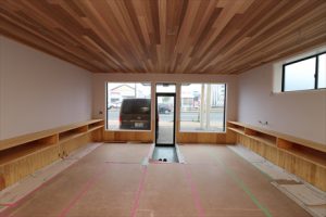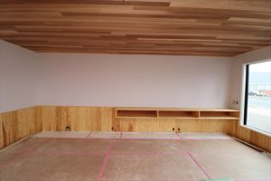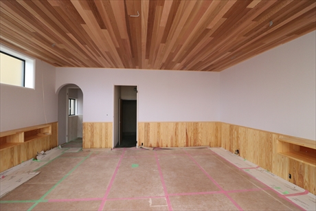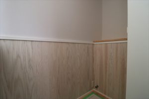 杉の腰板縦張りに白い無地の壁紙を貼って出来ました。
