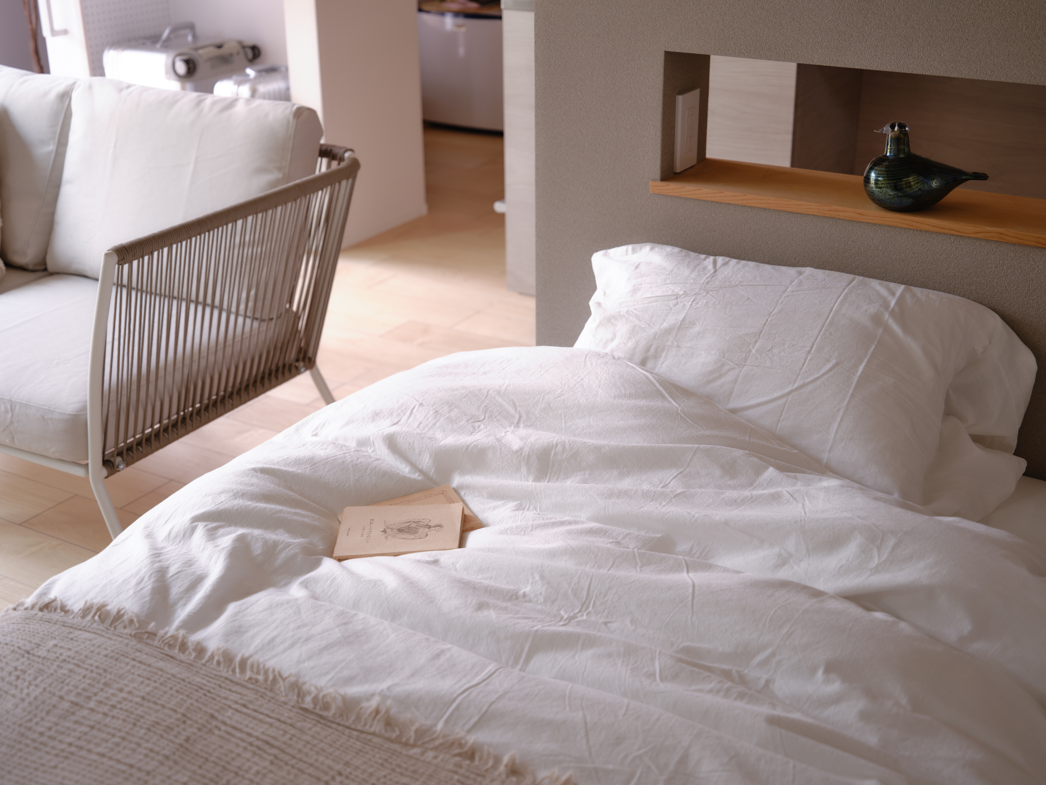 寝室と書斎を分ける必要はなく、ひとつの空間を「日中は仕事スペース」「夜はベットルーム」と使い分けるのもひとつの方法。建具や照明、家具の配置で緩やかに「時間帯」を切り替える工夫が有効です。