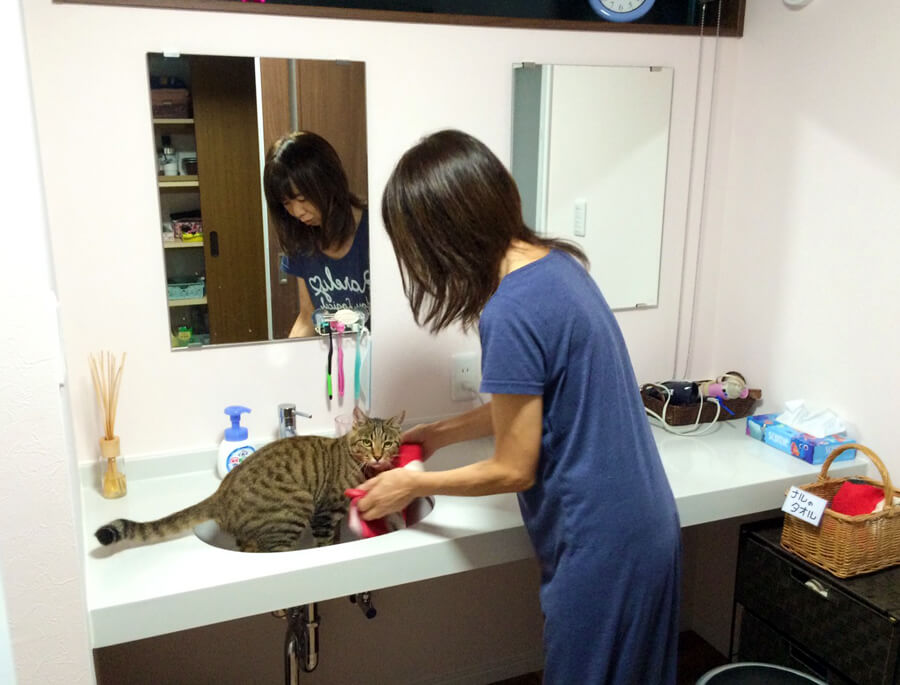 猫のナルくんがこうやって遊ぶんだよ・・・棚を上手に使って上がったり下りたり・・・洗面ボウルに寝転んでたり・・・この棚は来る人みんなから良いって言われる・・・