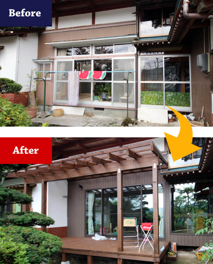 そして2期工事で残りの部屋の工事をし、梅雨明けに合わせてウッドデッキを造って完成です。