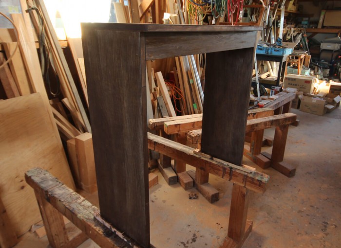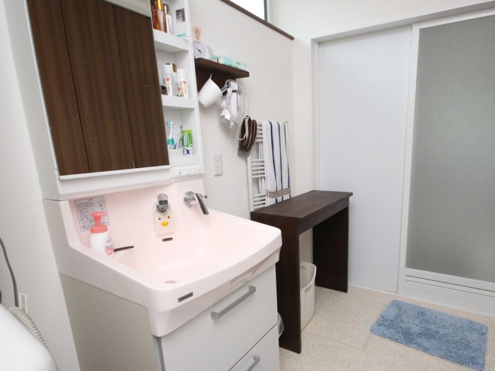 1階の洗面化粧台の脇に着替えを置いたり、化粧品を置いたり出来る台をこの家の無垢の床の色で造ってほしいという事でした。