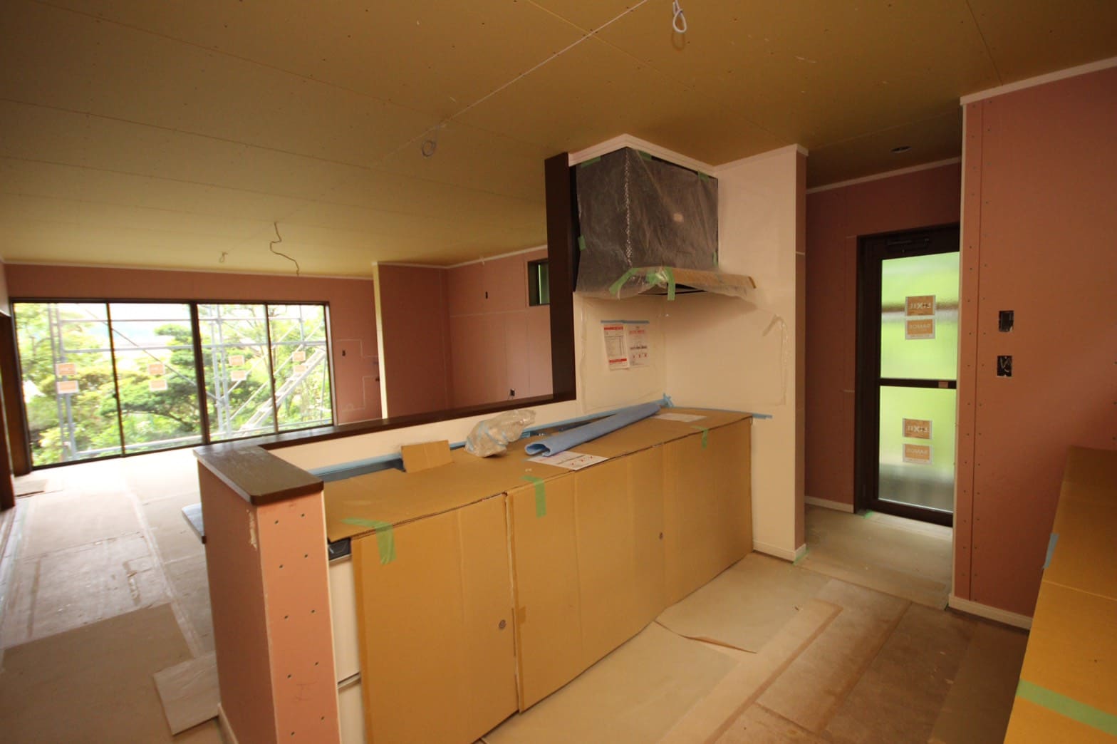 大工工事が終わり、木部の塗装をした翌日にキッチン組付けが始まりました。