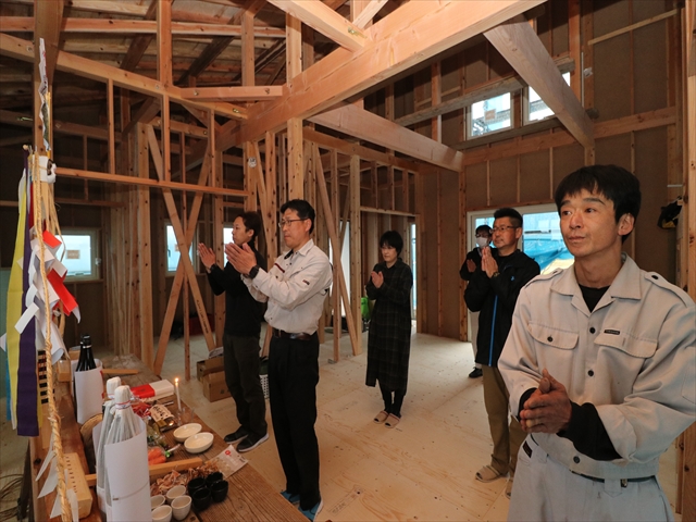 久しぶりの雨ではありましたが、もともと家の中で上棟式をする予定でしたので何も問題はなく滞りなく進めることが出来ました。