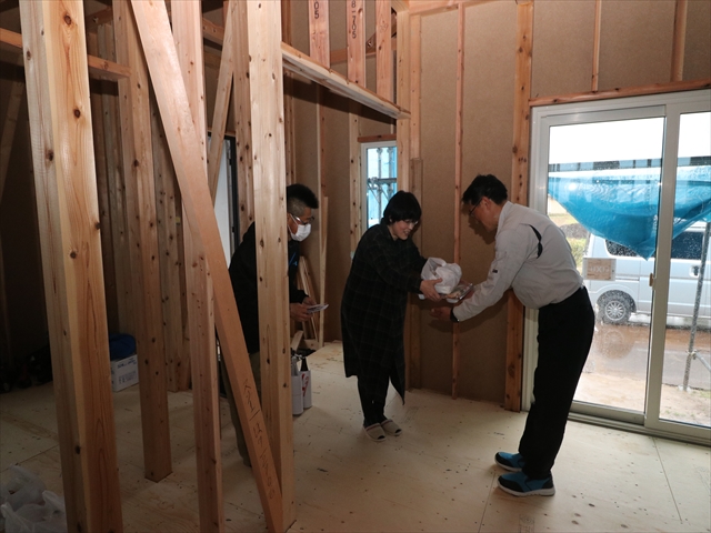 『今日は雨ですが、上棟式に雨が降ると【福が振る】とか【火事にならない】と言われています』と言っていました。