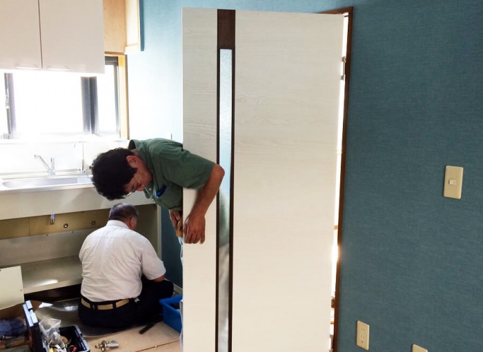 アパートの改装工事です。 クロス工事が終わり、オーダー建具の取付をしています。 近年、出来合いの戸を使う事が多いですが、造り替えとなると建具屋さんの出番なんですね。 デザインが古いとか言わせません! とっても素敵なデザインですね♪ 青い壁紙に白いドアが生えますね!