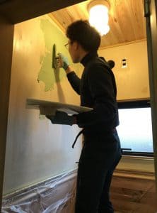 壁の腰高より上は天然ミネラル系塗り壁材《ヘルシーカラー》を塗りました。
